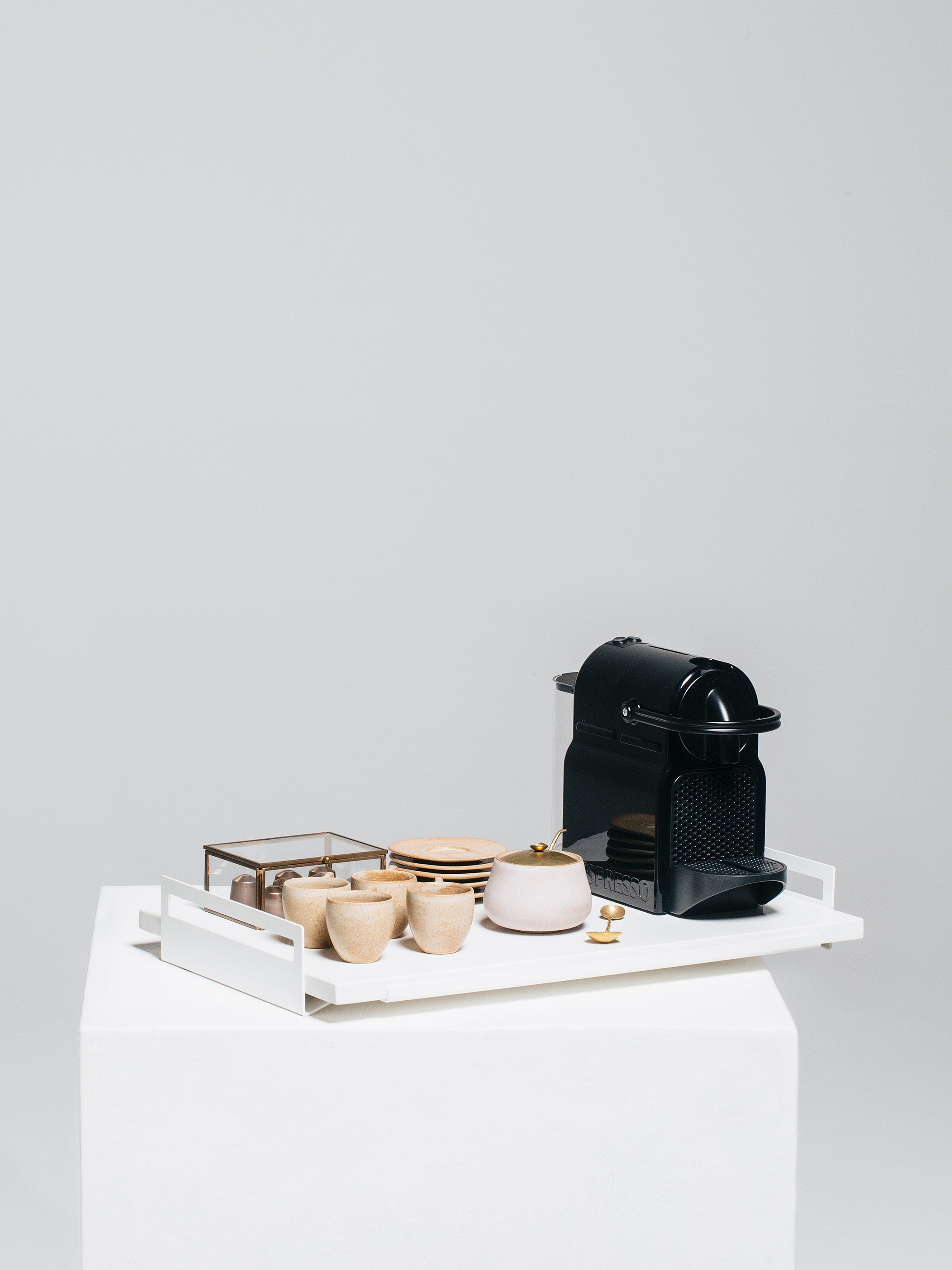 A bandeja Alça vem para criar seu cantinho especial: para sua cafeteira, para servir seus drinks, para seus objetos de lavabo, para montar seu bar. Ela é feita em aço-carbono e recebe pintura eletrostática.