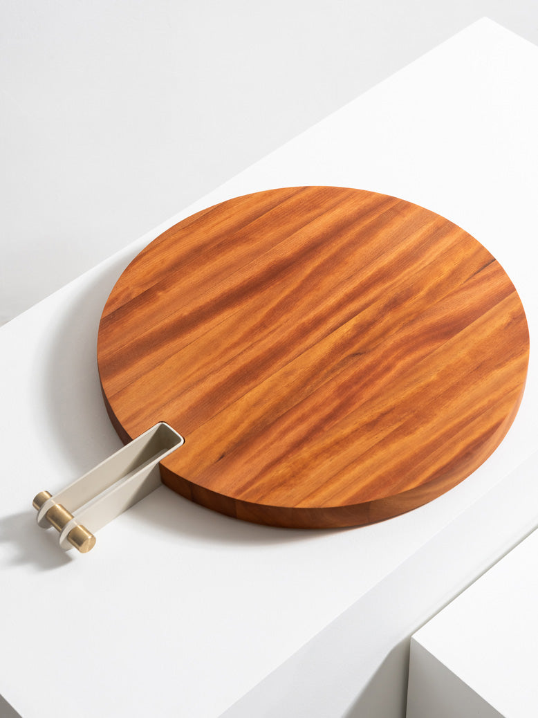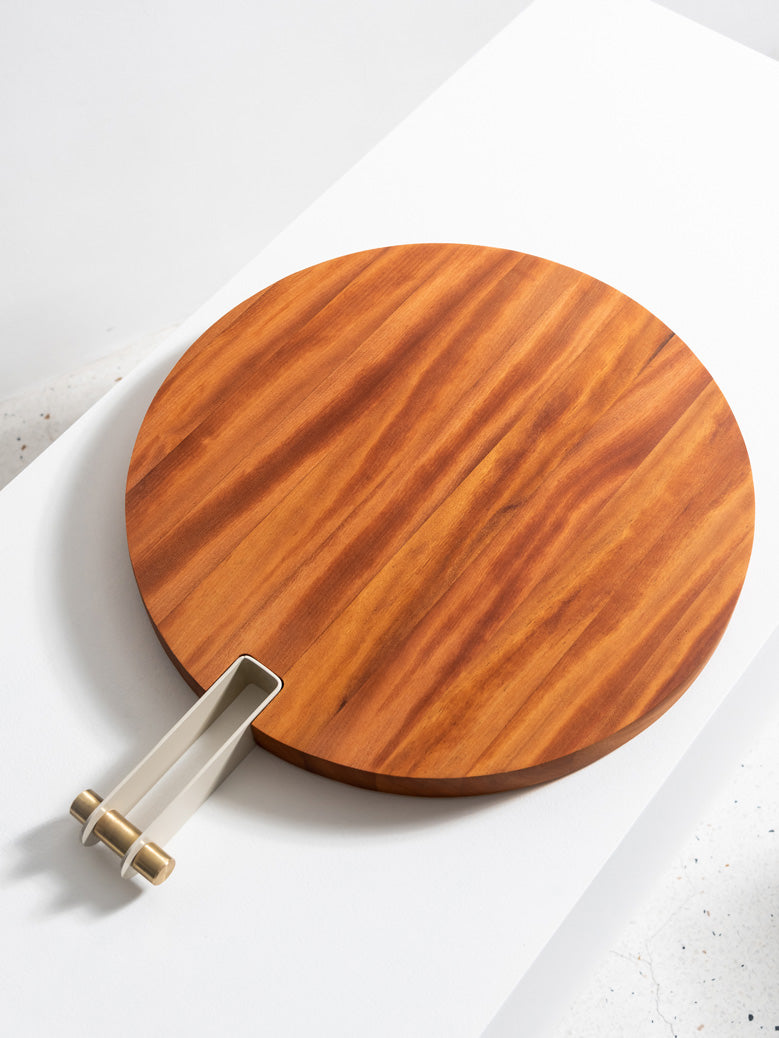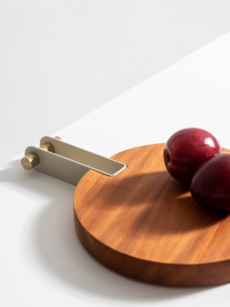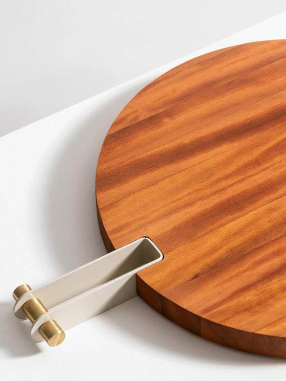 As Tábuas Etta são feitas em madeira Teca maciça, com cabo em aço-carbono que recebe pintura eletrostática em diversas cores. Seu acabamento pode ser em latão ou inox, para combinar com sua decoração.