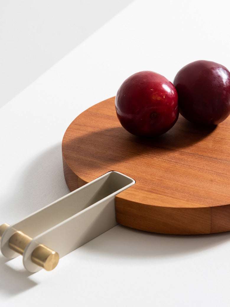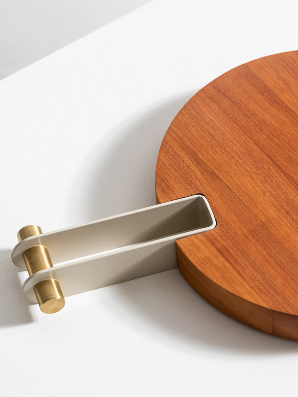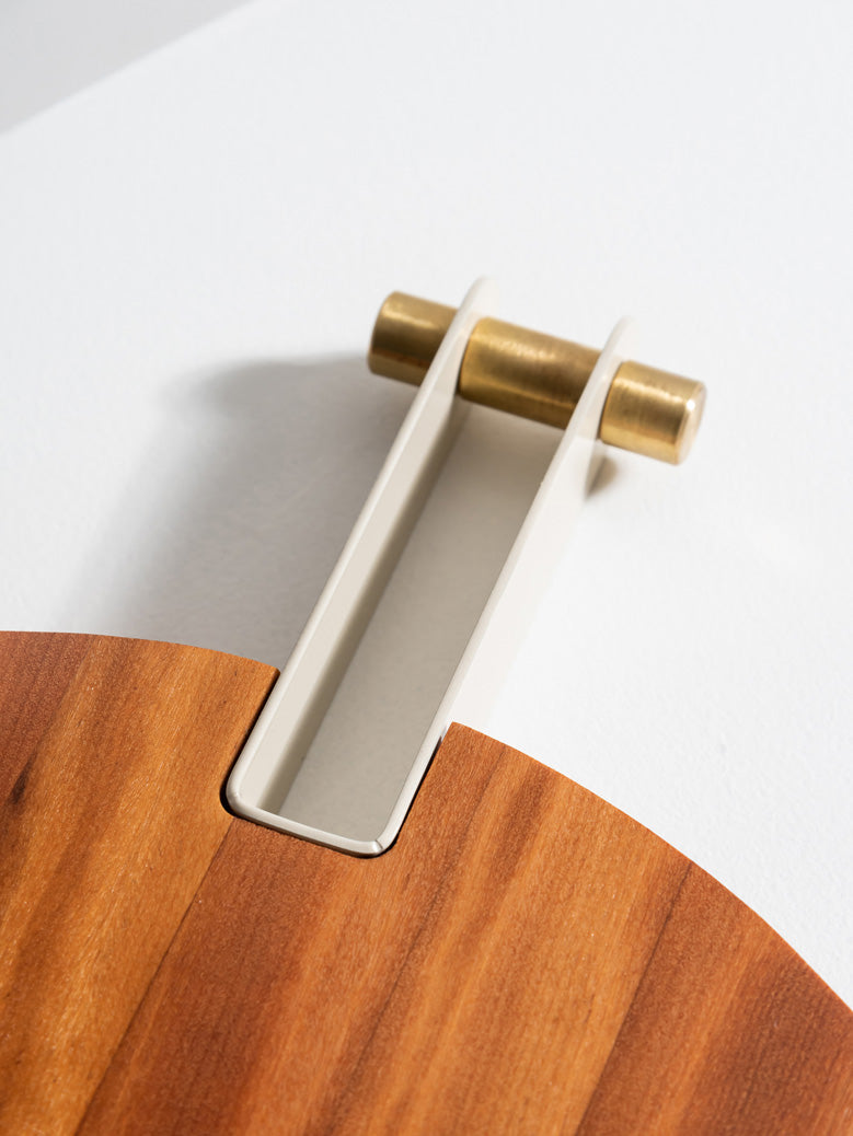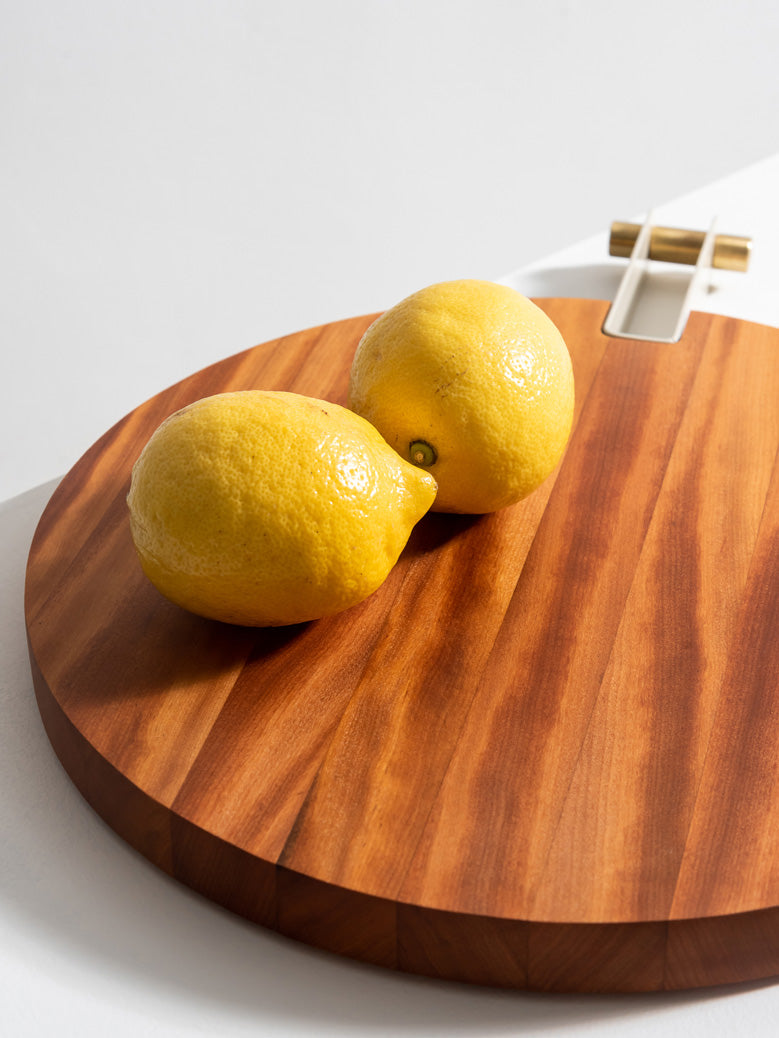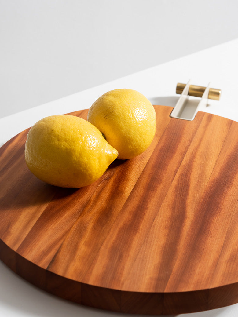 As Tábuas Etta são feitas em madeira Teca maciça, com cabo em aço-carbono que recebe pintura eletrostática em diversas cores. Seu acabamento pode ser em latão ou inox, para combinar com sua decoração.